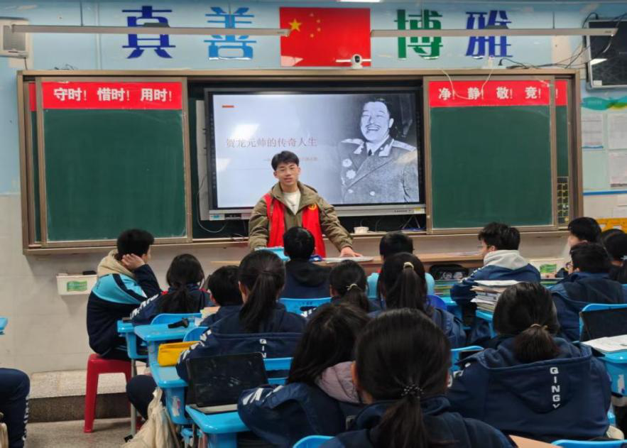 志愿者首先宣讲了贺龙元帅传奇的一生,通过生动形象的PPT和观看历史影像资料,让同学们仿佛置身于那段波澜壮阔的岁月,也展现了他一生为党鞠躬尽瘁的革命精神。随后,志愿者讲述了雷锋的生平事迹,在互动中引导同学们弘扬雷锋精神,争做时代新人。