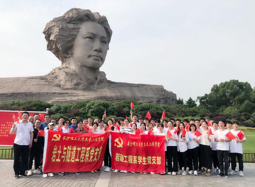 洲头石级上,师生党员手持红旗,在岩隧系学生党支部书记叶正芳老师的带领下,朗声吟诵《沁园春.长沙》,感受伟人心忧天下、济世救民的壮志豪情;高唱《我和我的祖国》等爱国歌曲,缅怀革命先烈的赤诚衷心和丰功伟绩。现场氛围热烈感人。红色诗歌吟唱激发学生学习土木工程专业知识的力量!在岩隧系教工党支部书记周德泉教授的引领下,刘龙武教授为同学们详细讲解了橘子洲形成的地质原因,曾参与长沙轨道交通2号线建设的张军教授结合亲身经历向同学们介绍了橘子洲站设计施工的难点及解决方案,系主任张永杰副教授介绍了橘子洲附近下穿湘江的南湖路隧道、地铁3、4号线的施工方案与技术难点,教师现场为同学们开展了别开生面的土木工程专业认知教育和工程地质实习,大学教师坚守教书初心、担当育人使命又一次完美呈现,正如凌同华教授在向同学们分享入党初心时所言:“对于教育工作者来说,做好教书育人的本职工作,就是最大的初心,也是最神圣的使命!”