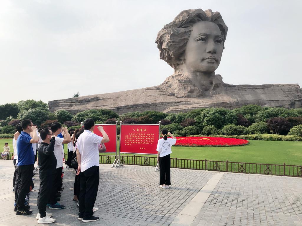 “我志愿加入中国共产党,拥护党的纲领,遵守党的章程,履行党员义务......”在毛泽东青年艺术雕像前,师生列队举握右手,在学生党员代表黎清蓉的领誓下,再一次重温入党誓词。誓言铮铮嘹亮,气氛庄严肃穆。