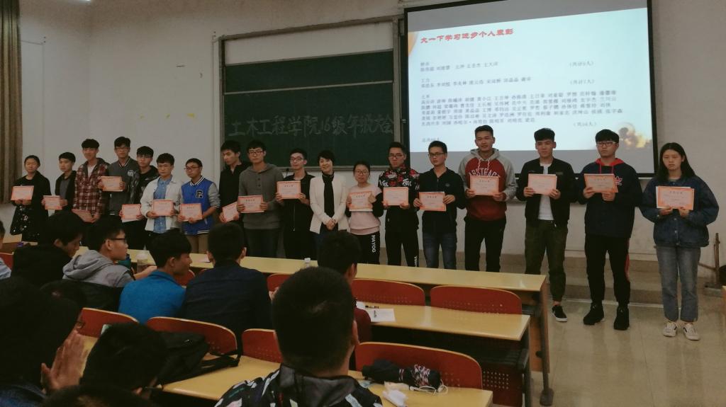 首先,贺老师通过回忆引导学生们感慨时间飞逝,大一已成为过去,2016级学生已由懵懂新生成为学长学姐,并引出主题:回首大一,步入大二的16级同学应该思考和面对些什么。然后,通过数据分析,对上学期全年级GPA情况、各专业GPA分布情况、各班级GPA分布情况、各班四六级过级情况、各班挂科率分布、各班简报日常通报情况进行对比分析,从而得出寝室氛围、班级班风学风以及个人自制力等因素对个人、寝室、班级成绩差距的影响。贺老师指出:大学是一个小社会,每一个同学都以一个社会人的角度加强自我管理,寝室、班级要营造良好的学习氛围,班风决定学风,学风决定成绩。各寝室、各班级间也应互相帮助,增强好的影响,要让每一个同学跟上学习的步伐,让不甘于落后的思想扎根于每一个寝室、班级。接下来,贺老师给大家分享了两篇文章,分别是刘墉的《谈自制,你有资格玩吗?》和taptap点点校友婉兮的《大学四年,我怎样弄垮了身体》,分别强调了学习中自制力的重要性和大学生活作息规律对健康的重要影响。最后,大会对成绩优秀和进步明显的学生、GPA排名年级前五的班级进行了表彰,颁发了“学习优秀奖”、“学习进步奖”、“优秀学习班级”的奖状和奖品。