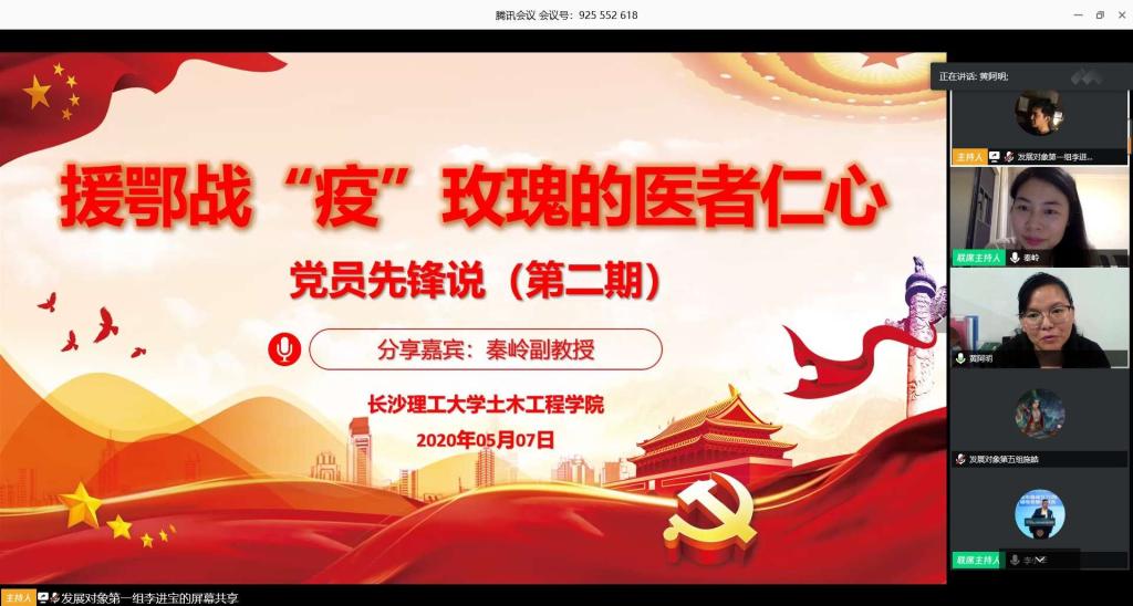 为深入学习领会习近平总书记关于疫情防控工作的重要指示精神,做好2020年春季学生开学准备工作。5月7日晚,土木工程学院特邀“最美逆行者”——中南大学湘雅医院援鄂医疗队副主任医师秦岭做客“党员先锋说”(第二期)活动,以直播的方式,为学院师生党员上了一堂触及灵魂深处的特殊党课。学生党总支副书记李小军主持学习,院党委副书记黄阿明,院团委书记綦丽、学工办叶正芳、董治佑老师和学生党员代表共计300人聆听了这堂特殊的思政大课。