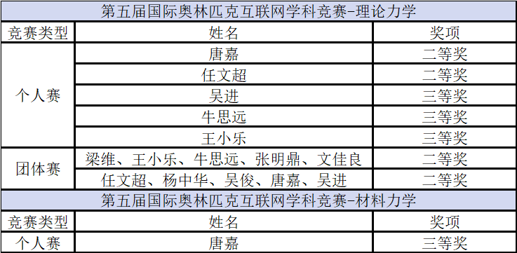 近日,第五届国际奥林匹克互联网学科竞赛“理论力学”和“材料力学”成绩揭晓。taptap点点体育学子首次参赛,便在与来自全球18个国家的理工科院校学生的激烈角逐中表现出色,共斩获理论力学个人赛二等奖2项、三等奖3项,理论力学团体赛二等奖2项,并在材料力学个人赛中收获奖项。获奖名单如下: