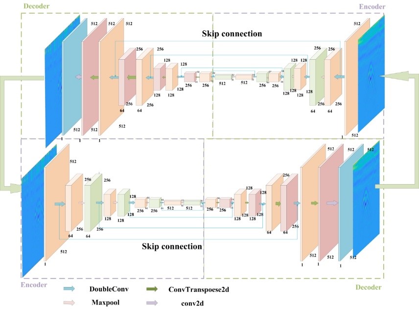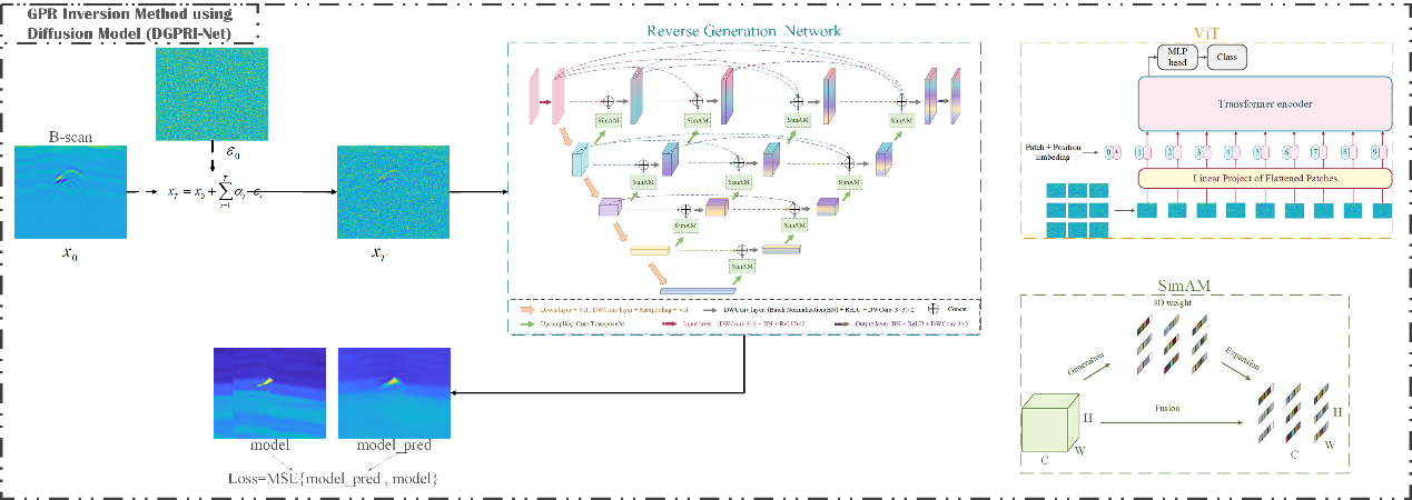 提出了多种创新神经网络结构,包括带Shuffle Attention机制的SAU-GAN网络、引入扩散模型的DGPRI-Net网络(图1)、构建正演-反演闭环结构的CL-CNN网络等结构。这些方法有效增强了模型对GPR信号特征的提取能力与反演鲁棒性,显著提升了在复杂地质环境下的成像精度。
