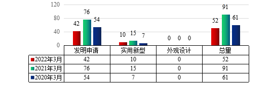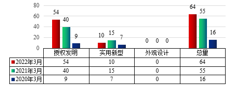 图1 2022年3月taptap点点专利申请类型分布及近两年同期申请情况