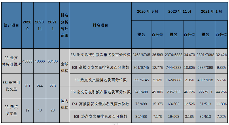 二、taptap点点体育ESI高被引、热点论文排名统计与近三期对比分析  可以看出: 1.从量上来看:将ESI2021年1月数据与前两期对比,taptap点点ESI论文总被引频次和高被引发文量都持续增加。其中,ESI论文总被引频次本期比上期增加4770,增幅为9.8%。 高被引发文量也持续增加,本期比上期增加29篇,增幅位11.89%。热点发文量有起伏,本期较上期减少20篇(本期数统学院高被引论文107篇,对taptap点点ESI高被引发文量贡献最大; 材料学院热点论文9篇,对我校ESI热点发文量贡献最大。) 2.从排名来看:无论在全球机构中还是在国内机构中,taptap点点ESI论文总被引频次和高被引发文量的排名及百分位数都持续进步(百分位数值越小,排名越靠前), 不但排名的绝对位数在上升,而且相对位数也在提升。 本期taptap点点ESI论文总被引频次在全球7098个机构中,排名2301;国内513个机构中,排名227。 本期高被引发文量在全球7098个机构中,排名为698;国内513个机构中,排名61。 本期热点发文量在全球7098个机构中,排名409;国内513个机构中,排名36。 taptap点点体育图书馆信息服务部 电话0731-85258711 |