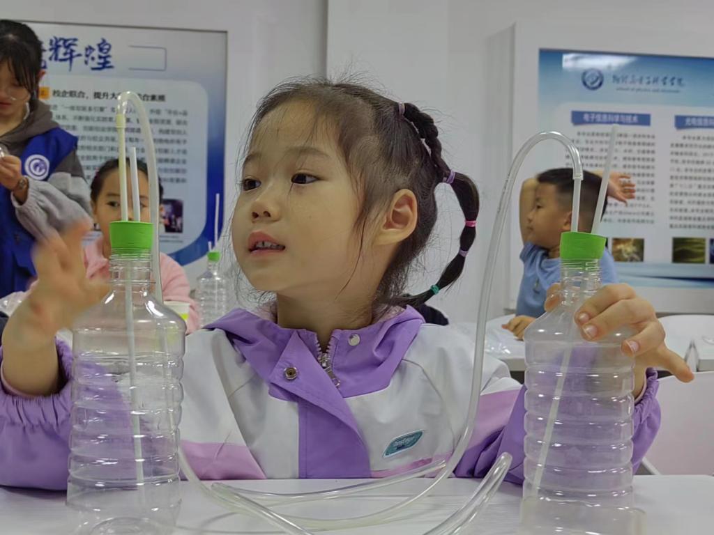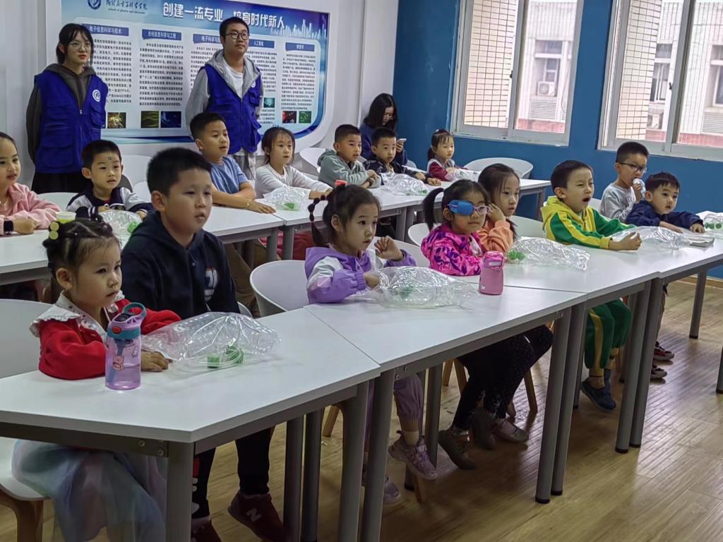 为使广大教职工在假期安心科研和工作,解决他们的后顾之忧,物电学院党委决定充分发挥学院优势,利用自身特色举行“爱心托管”,为老师们服好务。由学院学工办组织的“小小科学家”团队每年暑假都会走向社会为假期的留守儿童送去丰富的精神食粮,深受孩子们的喜爱。于是,学院合理安排团队中的大学生志愿者们利用课余时间行动起来,也为国庆假期中学校教职工的孩子们带来不一样的体验和快乐。五天时间学院共举办了3场“小小科学家,一起动起来”的互动课堂,孩子们在课堂上认真地听大哥哥大姐姐们讲解科学故事,在这些“哥哥姐姐”的指导下,孩子们听课非常认真,动手做起实验体验到知识的魔力和魅力,教室中不时传来惊讶声和欢快的笑声。