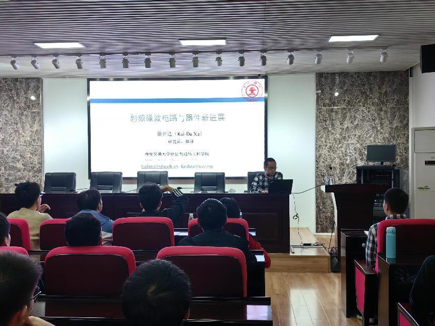 10月13日上午9:00,西安交通大学信息与通信工程学院研究员,博士生导师应邀作为我院电子信息类专业前沿系列名师专题课的主讲人,助力学术型人才培养。徐教授在理科楼B-413为学院电子系的同学们讲授了一堂以“射频微波电路与器件新进展”为主题的专题课程。前来聆听课程的师生合计110余人,学院副院长范志强出席会议。