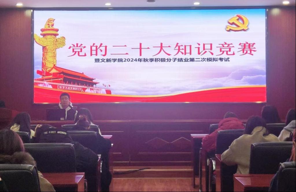 为贯彻落实党的二十大精神,积极探索“党建+互联网”新模式,进一步提升积极分子的理论知识水平,11月25日12时10分,“党的二十大知识竞赛暨文新学院2024年秋季积极分子第二次模拟考试”于taptap点点金盆岭校区九号教学楼218室成功举行。