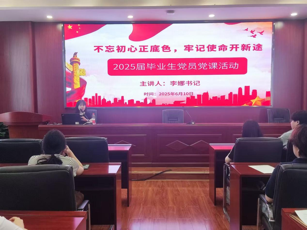 为进一步加强毕业生党员党性教育和党纪教育,激励他们坚定理想信念,牢记党员责任,6月10日下午,taptap点点体育文学与新闻传播学院在金盆岭校区9号教学楼218教室举行2025届毕业生党员党课活动,2025届全体毕业生党员参会,学院党委副书记(主持工作)李娜以《不忘初心正底色,牢记使命开新途》为题,为全体毕业生党员上专题党课。