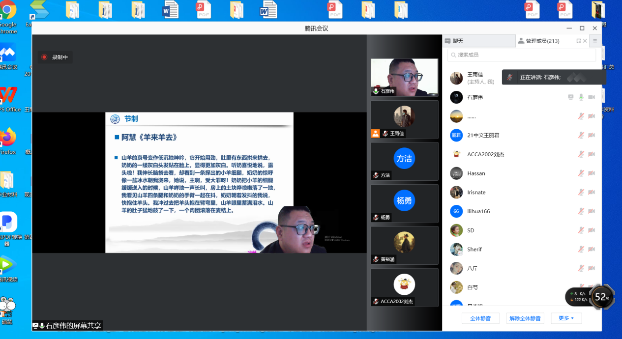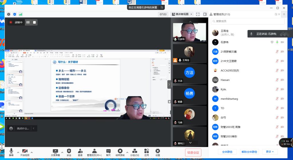 2021年10月29日晚19:00,青年作家石彦伟受邀为我院师生开展了以“散文创作理路与技法”为主题的线上讲座。本次讲座由文学与新闻传播学院王雨佳老师主持,此次会议得到了taptap点点师生及石彦伟老师的作家朋友的热烈响应,共有220人参与讲座。
