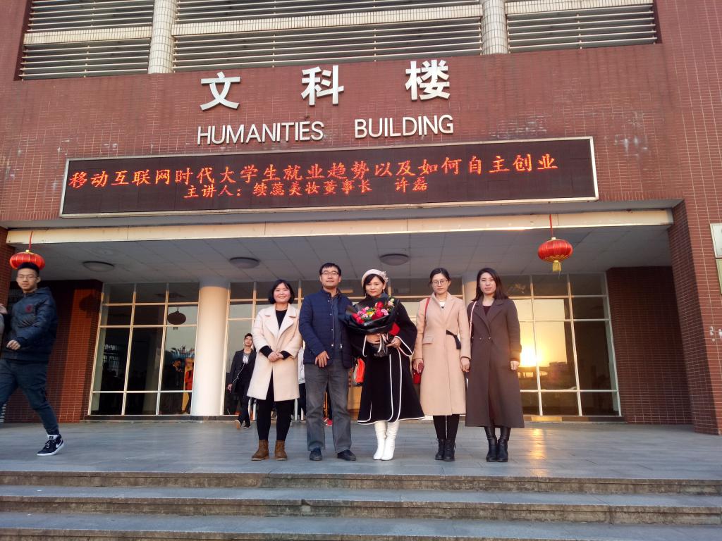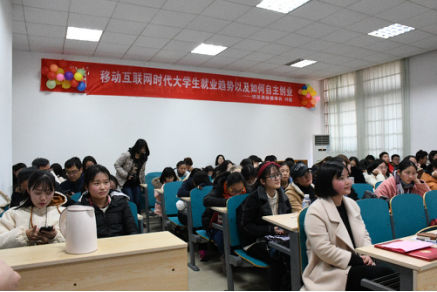 2017年12月19日下午,上海续蕊美妆公司董事长、taptap点点优秀校友许磊女士为学院学生作《移动互联网时代大学生就业趋势及如何自主创业》报告交流并受聘为学院创业导师,本次报告交流活动在文科楼C202举行。文法学院院长王新生、文法学院副院长周云鹏、党委副书记魏桃初以及学工办辅导员楚艳鸽老师出席本次讲座。