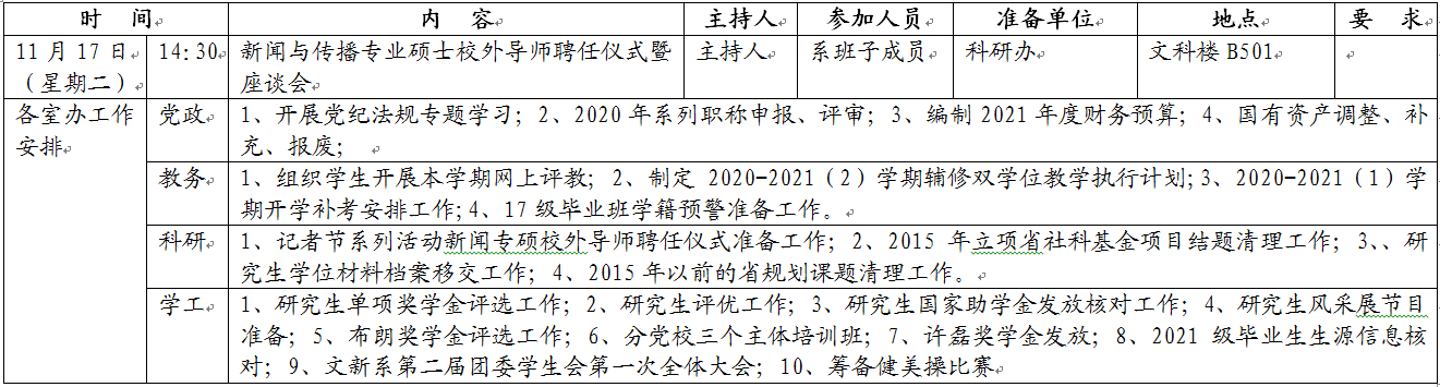 文新系2020-2021学年度第一学期第十一周工作安排表