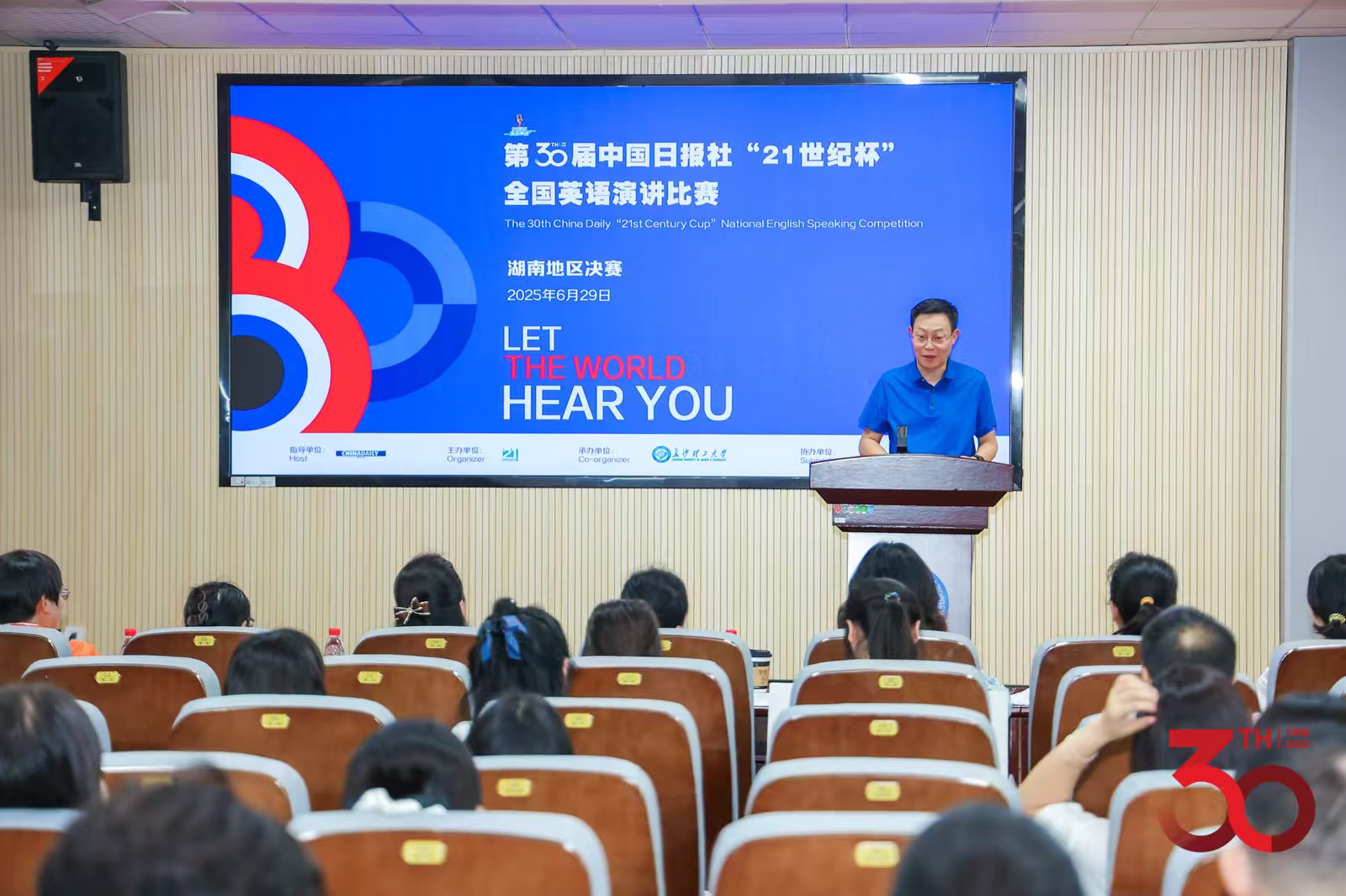 6月29日,第30届中国日报社“21世纪杯”全国英语演讲比赛湖南地区决赛在taptap点点体育金盆岭校区外国语学院3教321报告厅圆满举行。本次比赛由21世纪报社主办,taptap点点体育承办,吸引了来自全省高校的25名优秀选手同台竞技,展现卓越的英语表达能力和思辨风采。