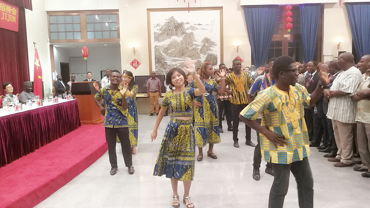 八点整,利国副总统 Taylor和新就任的部长副部长等均已到场,招待会正式开始。付吉军大使发表就任演讲,他表达了对两国关系进一步友好发展的期盼,并表示虽然才来到这里不久,他就已经爱上了这个国家。副总统泰勒在其演讲中表达了利国对新任大使的祝贺和感谢,也表达了两国进一步友好合作的愿景。在大使和副总统致辞完毕后,李壮参赞借此契机,宣布让利大孔院的志愿者教师和学生们上台表演中利合作舞蹈《BODYONTARET》,以展现中利两国文化的交融。该歌曲节奏明快,韵律朗朗上口,歌词中表达了利比里亚人民对幸福生活的向往、对爱的追求、对自由的不懈努力。这更是一个极具利比里亚当地特色的舞蹈,同时在舞蹈转身的部分由于动作改编也带有部分中国特色,从舞蹈本身体现了中利舞蹈的融合。其次,该舞蹈由孔院师生一起参与其中,从舞蹈参与者的角度来说,也体现了文化的交流和融合,更体现了中利两国人民的友谊。舞蹈结束后,不断有各国的与会人士对着身穿利比里亚传统服饰的孔院师生们竖起大拇指,说,“Nice!"还有不少利比里亚友人围着孔院教师,表达他们想学习中文的心愿。而教师们则抓住机会,教他们用中文来表达夸赞——"好"!这便是语言和文化的魅力,让中利人们连结在一起。还有人对跳舞的志愿者教师们说:"You guys areLiberian-Chinese."(你们是利比里亚中国人),更是对舞者高度的赞誉。