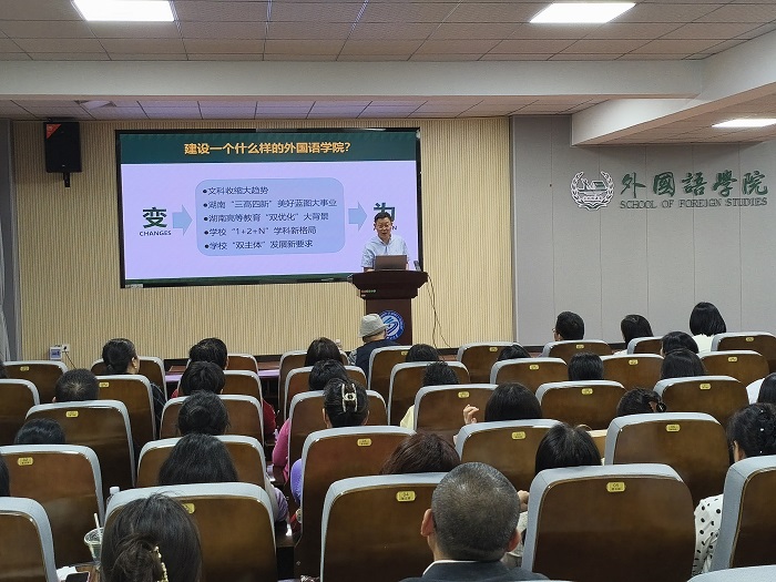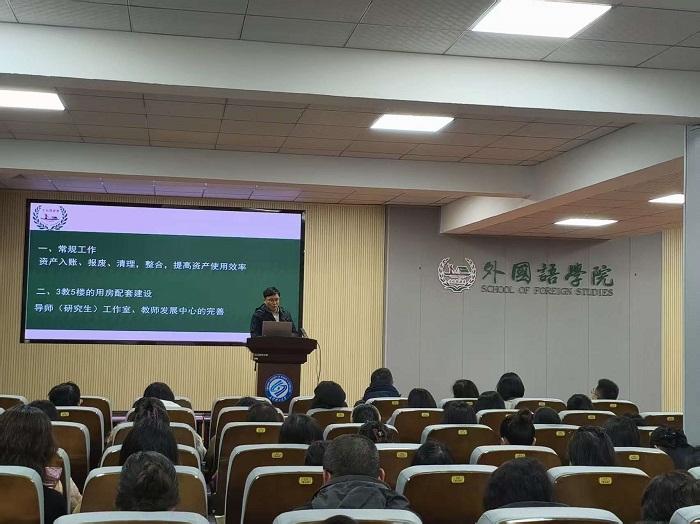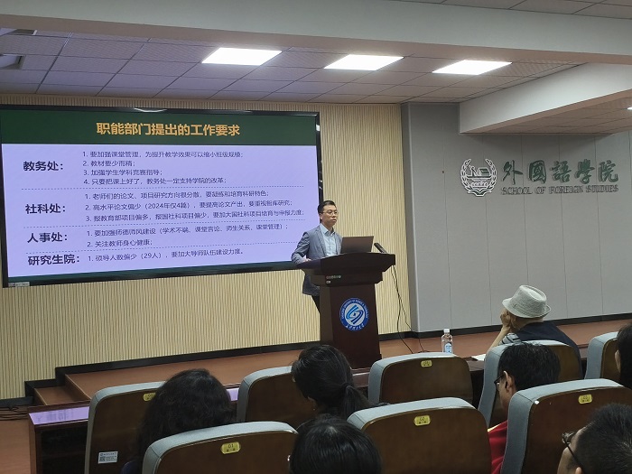 院长段胜峰做了题为“准确识变 科学应变 主动求变 开创学院发展新局面”的主题报告,全面分析了学院发展面临的新形势新要求,从“完善公共外语教学”“提高专业人才培养质量”“提升师资队伍能力”三个方面提出了学院进一步深化改革的主要措施,安排了下阶段的重点工作。
