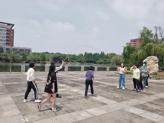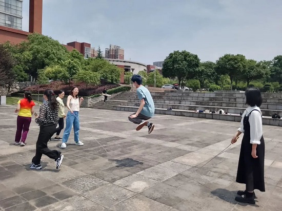 比赛在云塘校区云影湖南广场拉开序幕,共有4支队伍,每队均包含学生和教师。赛前热身时,老师和学生就忙得不亦乐乎,摇绳的节奏,穿插的速度,跳跃的幅度,广场上叫声此起彼伏,师生之间的距离拉近不少。
