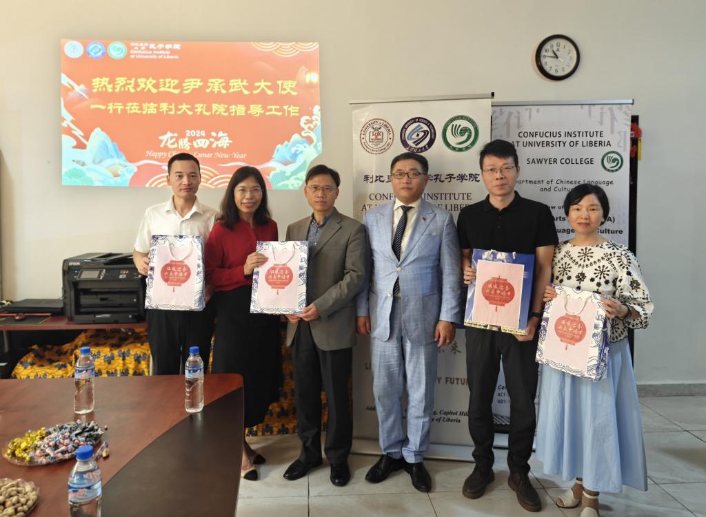 2024年2月8日,在龙年春节即将来临之际,中国驻利比里亚使馆大使尹承武先生,商务参赞王嘉欣先生以及秘书苟飞先生一行人等满载新春贺礼,专程来到利比里亚大学孔子学院进行慰问。他们的到来为孔子学院带来了浓浓的暖意。