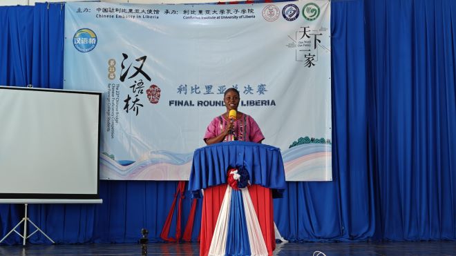 观看了选手们的比赛之后,利比里亚教育部助理部长Nyensuah女士上台致辞。她深情回顾了自己在中国的教育经历,并对曾经帮助过她的中国人表示衷心感谢。参赛选手的出色表现让她赞叹不已。她指出,正是孔子学院教师们的辛勤付出,培养出了一批汉语流利的优秀学生。同时她还鼓励更多利比里亚人学习汉语。