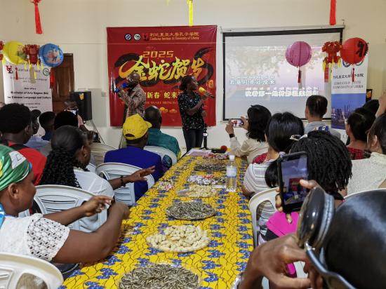 当地时间2025年1月25日,利比里亚大学孔子学院在中方教师驻地举办了一场热闹非凡的春节联欢会。此次联欢会吸引了援利医疗队、在利中资企业代表、孔院教学点负责人、众多师生、以及利国中文爱好者们的热情参与,近百人欢聚一堂,共庆2025中国农历新年的到来。利比里亚多家知名电视、广播及主流网络媒体对本次春节联欢会进行了全程直播及新闻报道。