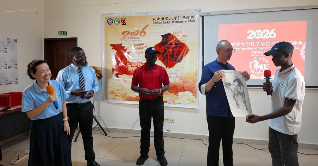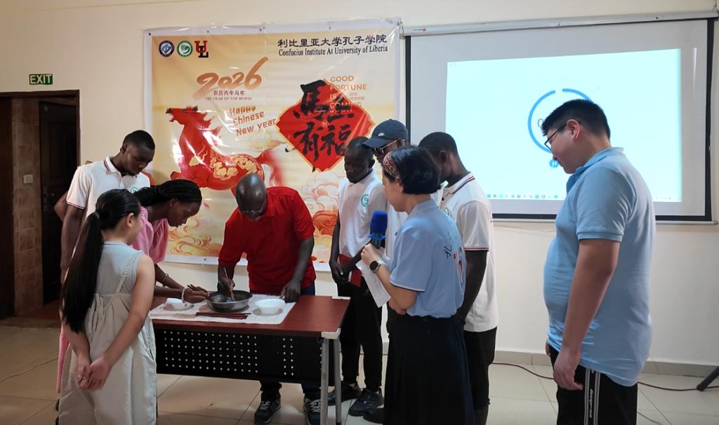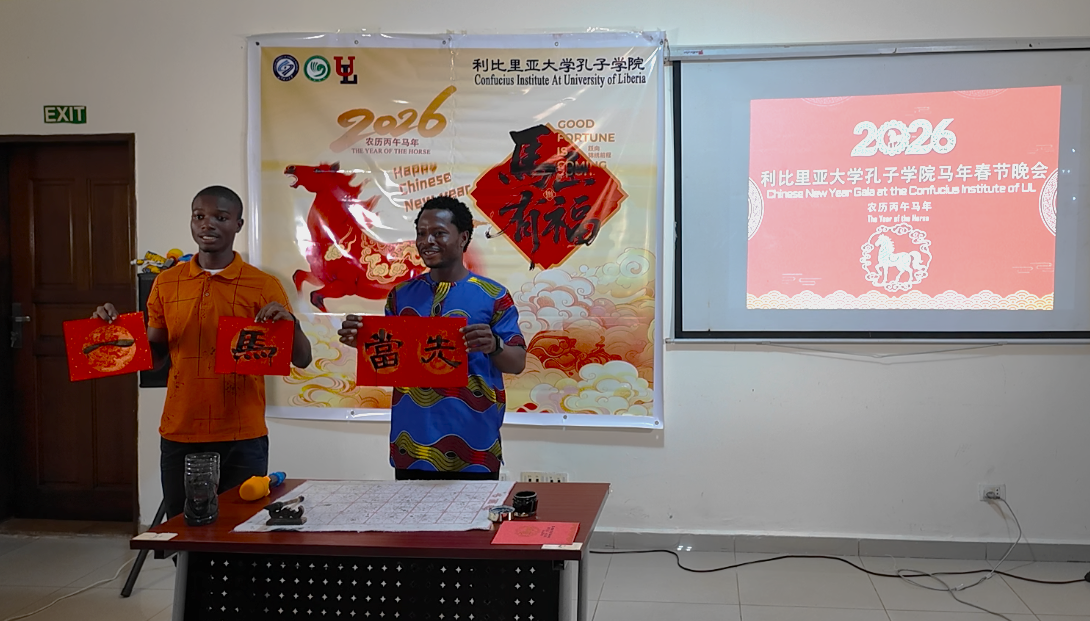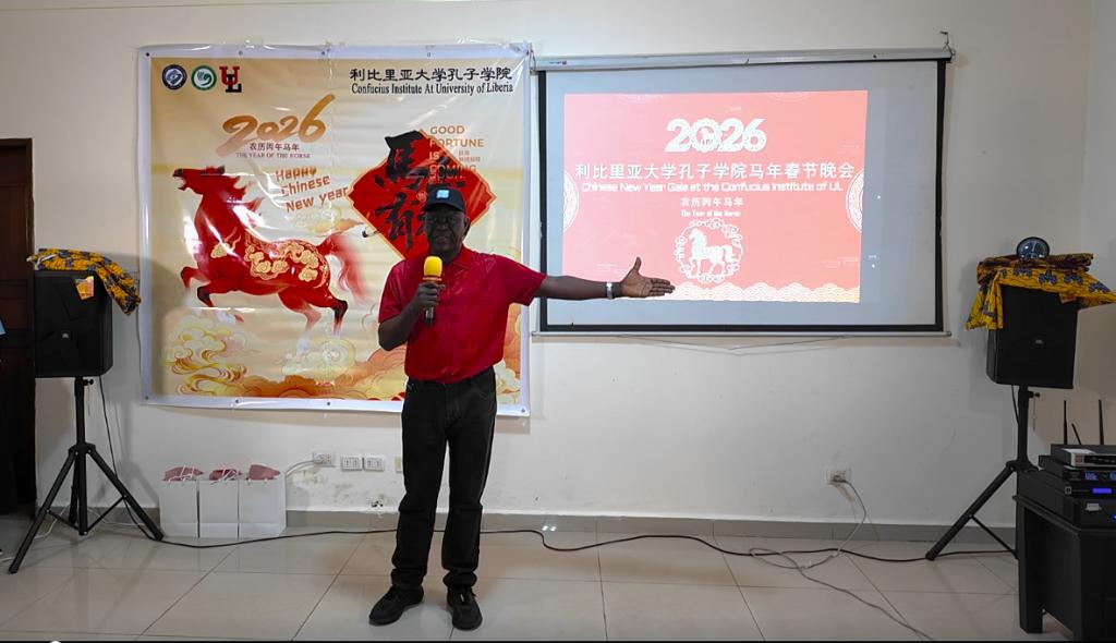2026214日,由利大孔院举办的“马上来福”春节联欢会在蒙罗维亚隆重举行。孔院师生、中国援利医疗队成员、藤编组代表、中资机构人士及中文爱好者近百人欢聚一堂,共贺马年新春,多家主流媒体跟进报道,现场直播同步进行。
