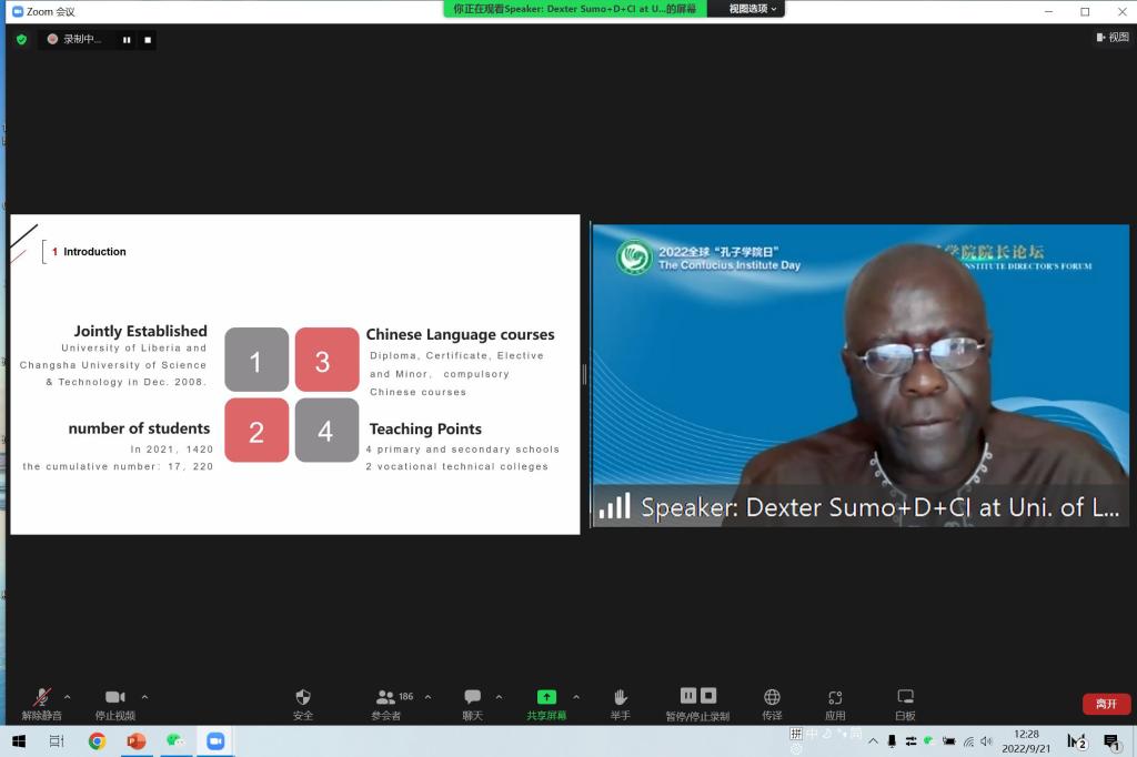 作为全球“孔子学院日”系列活动之一,由中国国际中文教育基金会联合北京外国语大学主办的“2022 年孔子学院院长论坛”于9月14日至24日举办。本次孔子学院院长论坛旨在进一步加强全球孔子学院间的协同合作,夯实孔子学院内涵式发展的基础,共同探讨未来可持续高质量发展之路。论坛包括2场专题讲座及3场分论坛研讨,近600名中外方院长报名参与,26位院长做主题发言。院长们畅所欲言,各抒己见,就孔子学院如何提升师资质量、孔子学院如何更好服务当地社会、塑造品牌形象、孔子学院如何因地制宜谋发展等议题发表自己的看法。9月21日,利比里亚大学孔子学院利方院长SUMO应邀在论坛上做了题为“如何解决利比里亚孔子学院面临的制约问题”的主题发言。