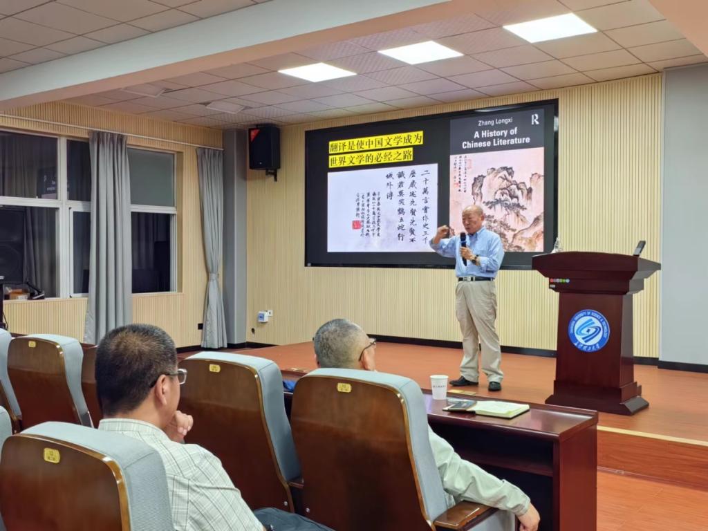 2024年6月17日晚,湖南师范大学潇湘学者特聘讲座教授、院士,瑞典皇家人文、历史及考古学院外籍院士,欧洲科学院外籍院士张隆溪教授在金盆岭校区3教321会议室,为外国语学院师生开展了题为“文学翻译、文学理解与世界文学”的学术讲座。段胜峰院长主持,刘彬副院长、学院科研骨干、研究生等近百名师生参加了此次讲座。