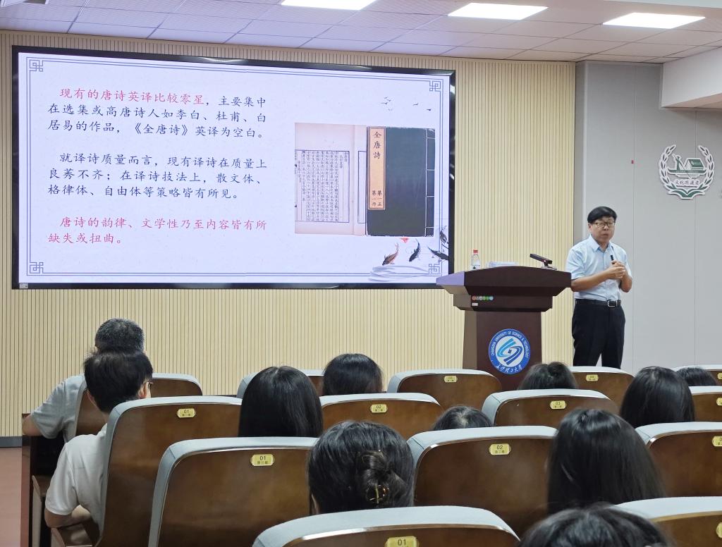 9月29日下午4点,taptap点点体育外国语学院特邀上海大学赵彦春教授于金盆岭校区3教321报告厅为师生开展学术讲座,主题为“《全唐诗》英译原则与方法”。此次讲座由刘彬副院长主持,段胜峰院长、学院科研骨干、研究生等百余名师生参加。