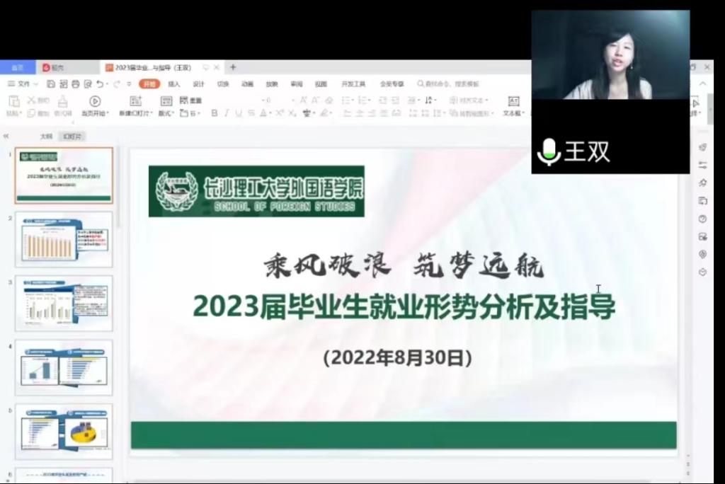 其后,王双做就业动员和指导。她详细分析了2023届毕业生面临的就业形势,介绍了学院近三届毕业生就业的基本情况,对学院目前就业现状和存在的问题进行了阐述,指出了就业的十大误区,并提出了分别针对考研生、就业生的就业思路。她指出,受到全球疫情形势和国家双减政策的影响,我院毕业生传统的就业去向外贸行业和教培方向均遭受重创,英语专业就业形势十分严峻,希望广大毕业生降低就业期望值,先就业后择业,不怕失败、勇于尝试,用拼搏的精神为自己争得一个光明的未来。