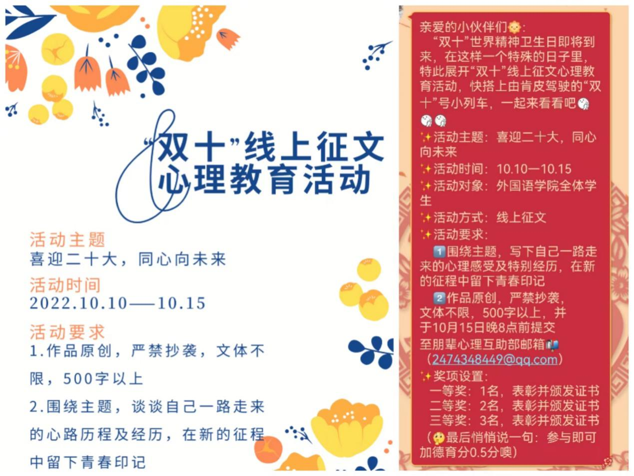 为提升大家对于心理健康的关注度及心理健康素养,推动形成良好校园氛围,外国语学院于2022年10月10日-15日特此开展以“喜迎党的二十大,同心向未来”为主题的“双十”线上征文活动。活动面向外国语学院全体学生,共收到征文81份。