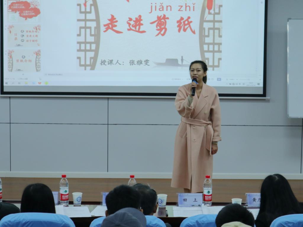 张雅雯同学的授课主题为《走进剪纸》。课堂正式开始前她设置了热身环节,以中国艺术相关的问题为导入,顺利过渡到中国剪纸的主题。讲课期间,她引导留学生组织语言形容剪纸的形状和颜色,带领留学生们在课堂上动手剪纸,使其在实践中体会剪纸的乐趣,在颜色各异的卡纸上,他们剪出了丰富精美的图形,切身体会着中国剪纸艺术的魅力。