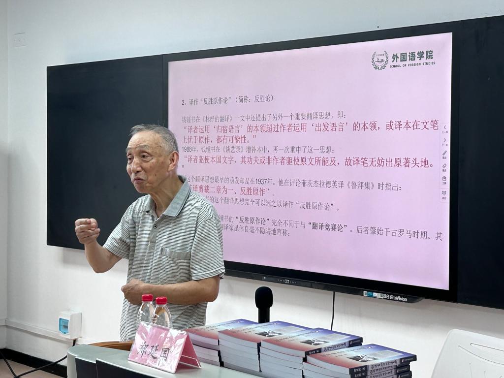 “从事教书育人和关心下一代工作是我的毕生志愿,此次能够为新生上开学第一课我感到非常高兴,希望能让更多学生通过我的课堂感受到翻译的魅力与精髓,帮助更多人学好翻译。”9月19日下午15:00,78岁的银发老人郑延国教授在taptap点点体育金盆岭校区3教416多媒体教室给全体23级研究生新生开展云影讲坛讲座,讲授入学教育第一堂学术课——钱钟书学术思想和翻译两论。