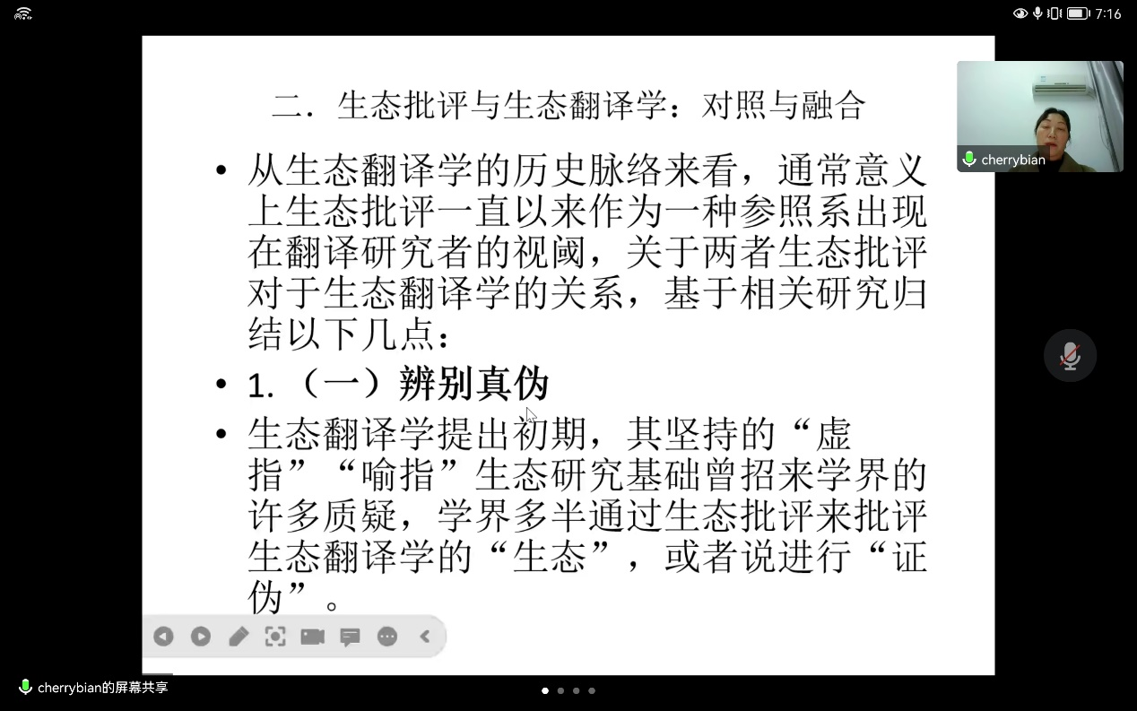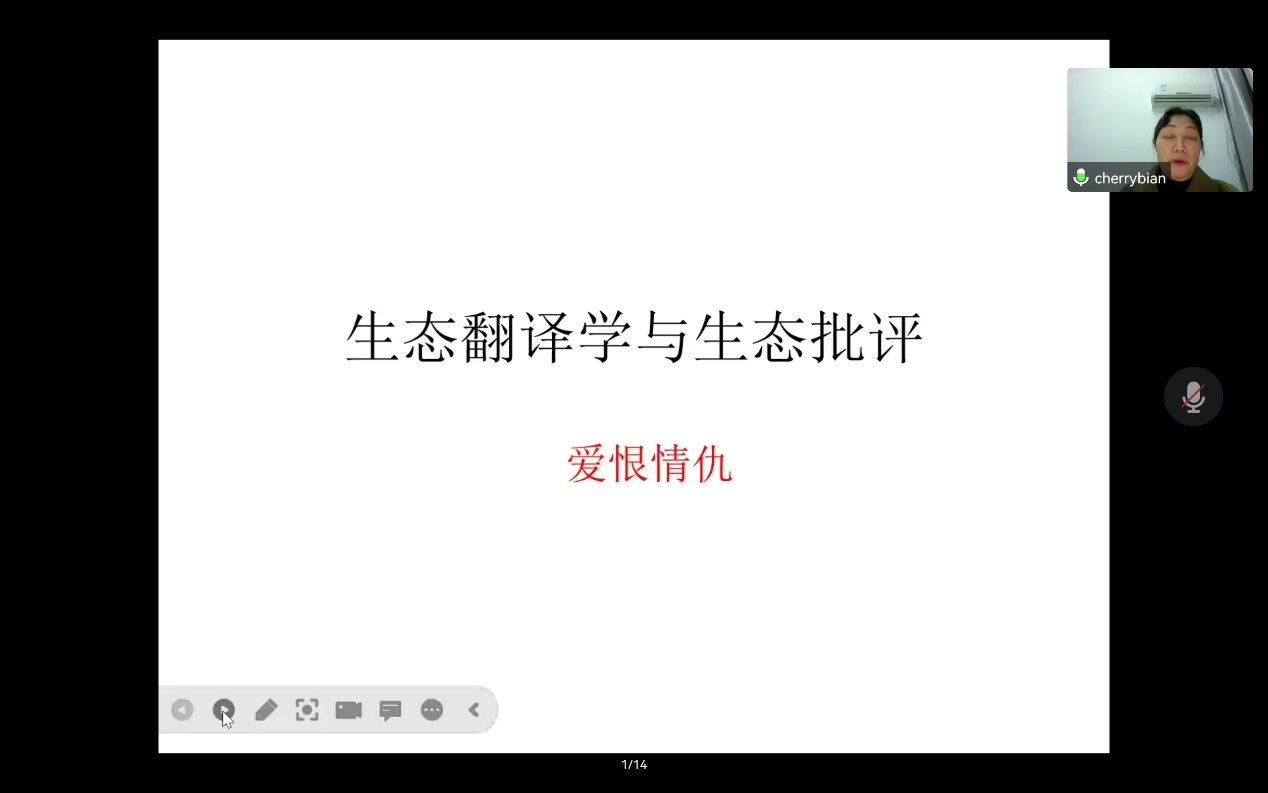 2022年12月14日晚,我院边立红副教授应邀为taptap点点第十八届博力学术论坛“翻译生态与生态翻译”专题论坛做了题为“谈谈翻译的自然维度”的讲座。外国语学院部分导师及全体研究生参加了本次讲座。