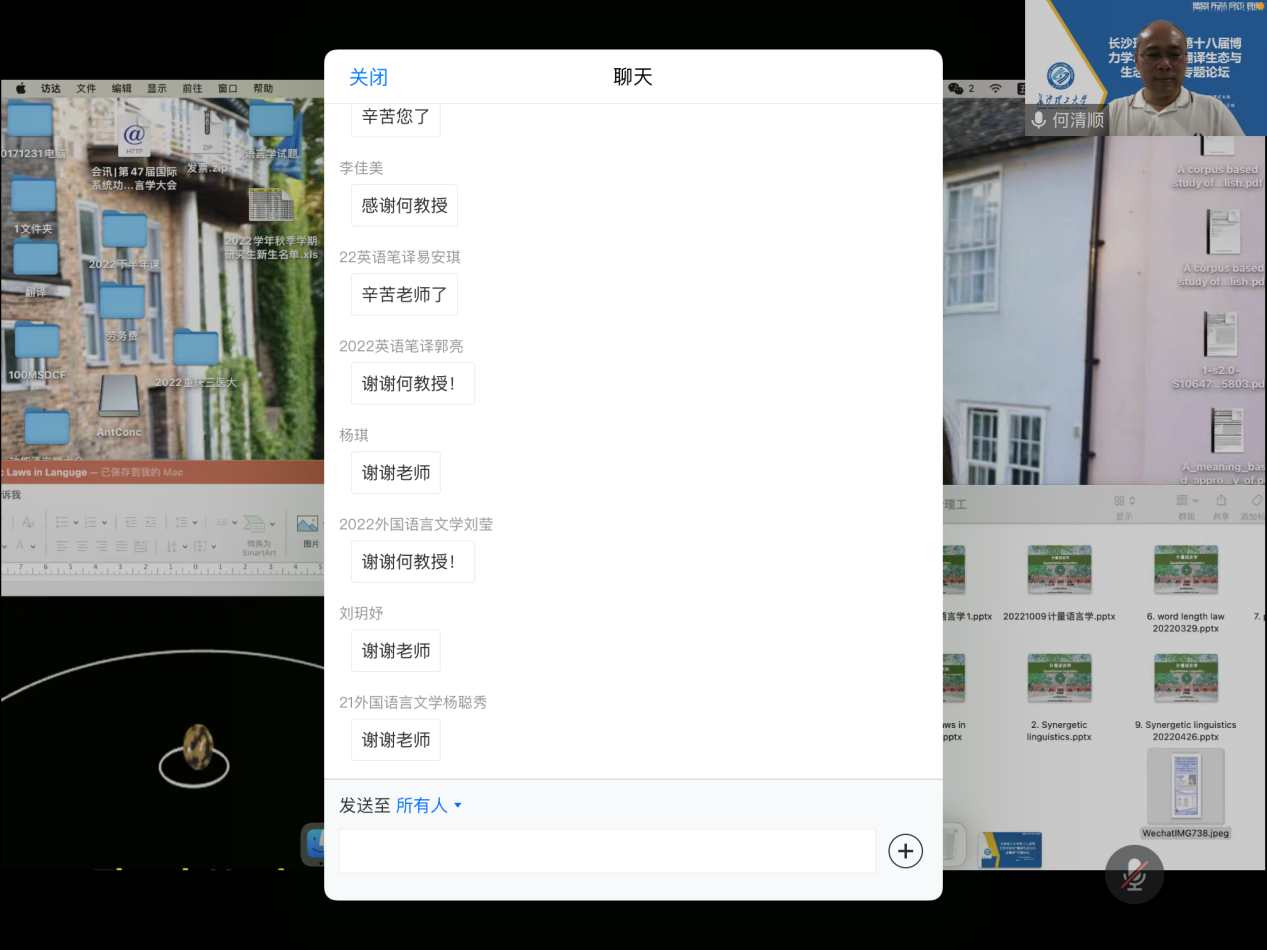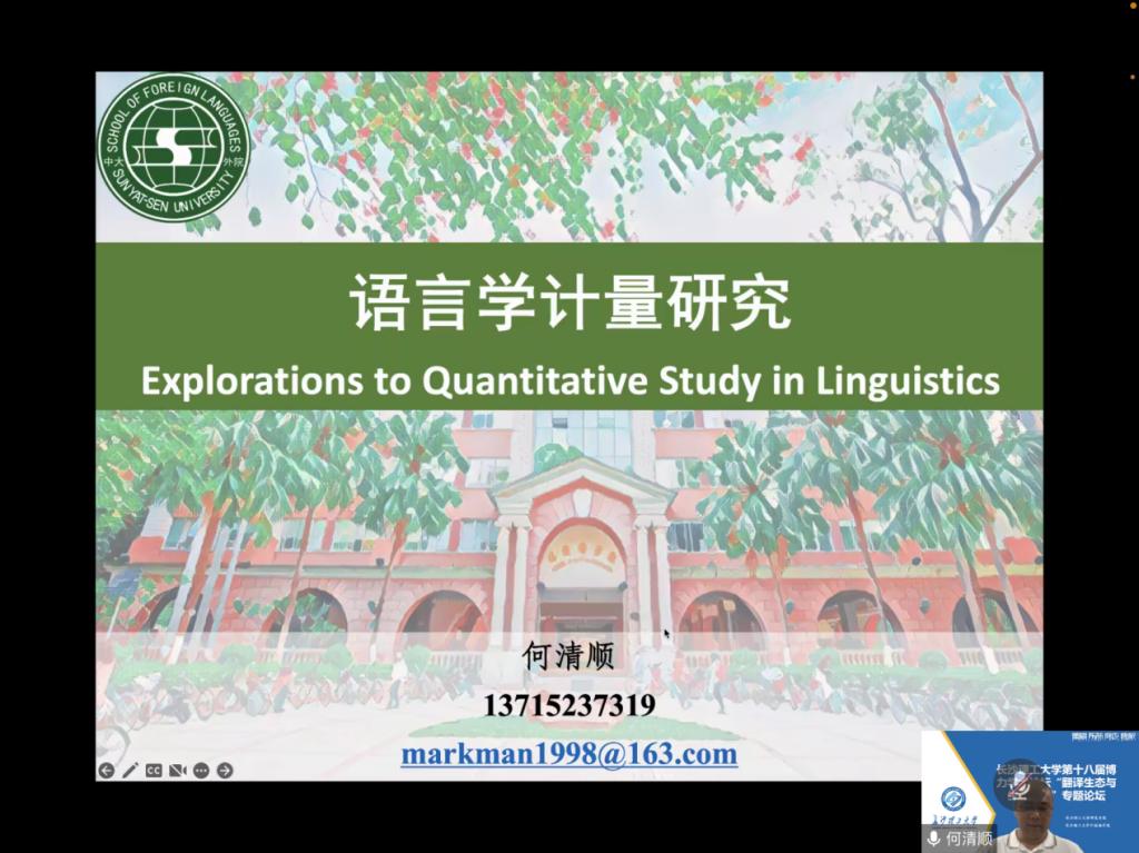 2022年11月,中山大学外国语学院博士生导师何清顺教授应邀为taptap点点第十八届博力学术论坛 “翻译生态与生态翻译”专题论坛作了题为“语言学量化研究”系列专题讲座。讲座共5场,围绕语言学量化研究的概念与内涵展开。外国语学院全体研究生及部分导师参加了讲座。