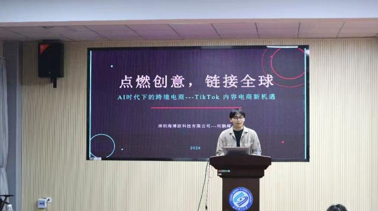 丁成飞老师首先介绍了海博欧科技有限公司的发展概况及跨境电商行业现状,帮助同学们快速建立行业认知框架。随后,何鹏辉老师围绕AI与跨境电商的深度融合展开讲解,从AI赋能内容创作、流量运营、用户转化等多个维度,结合真实案例拆解工具落地路径,分享了可直接借鉴的运营思路与成长方法。全科军总经理则对学院的支持表示感谢,并就校企合作比赛提出具体要求,同时结合行业发展趋势,为同学们的职业规划给出了实用建议。