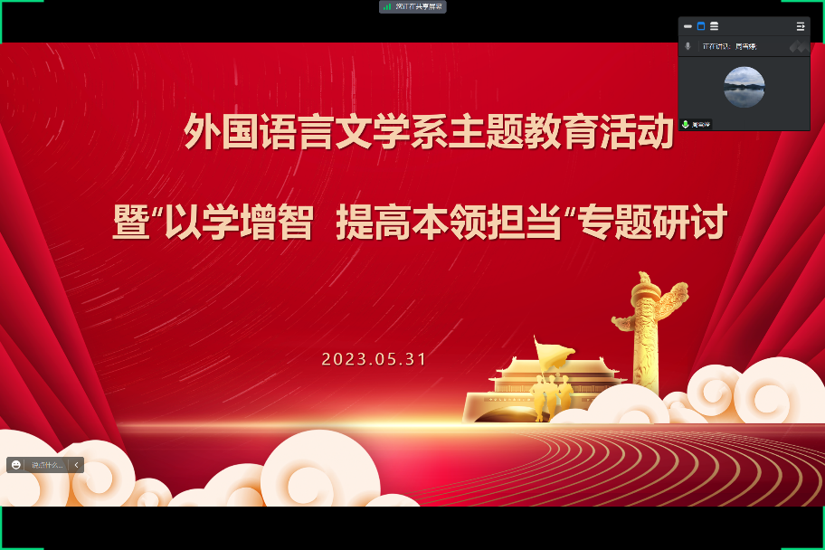 5月31日,外国语言文学系党支部开展理论学习暨“以学增智,提高本领当担”专题研讨会。会议采取线上腾讯会议方式进行,支部书记姚尧主持,英语系和翻译系全体老师参加。