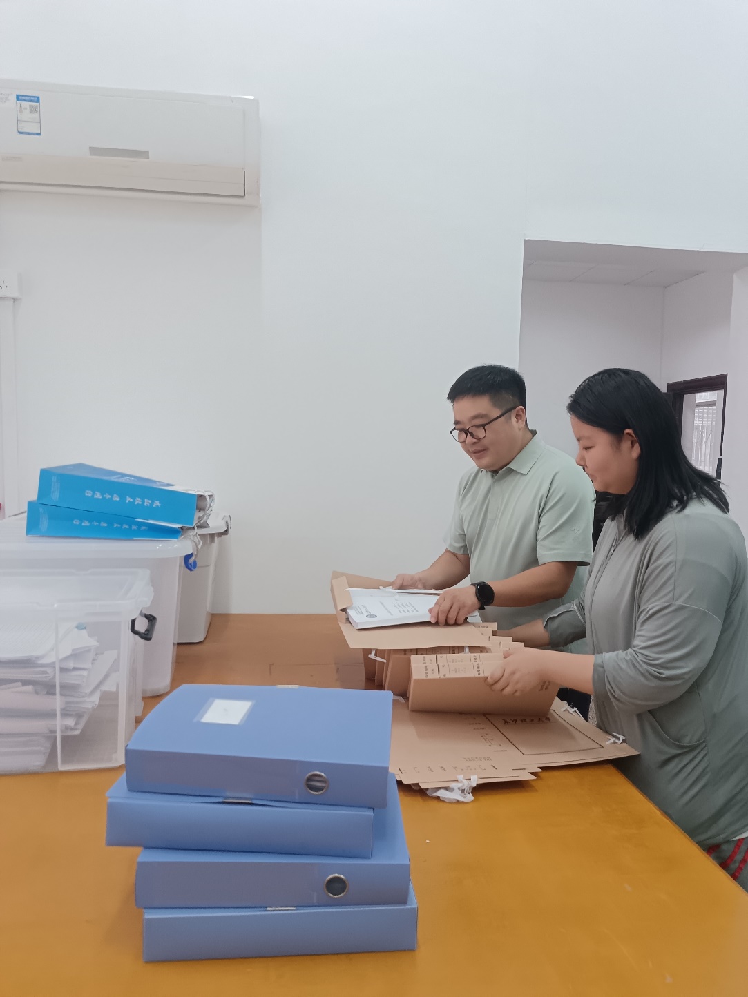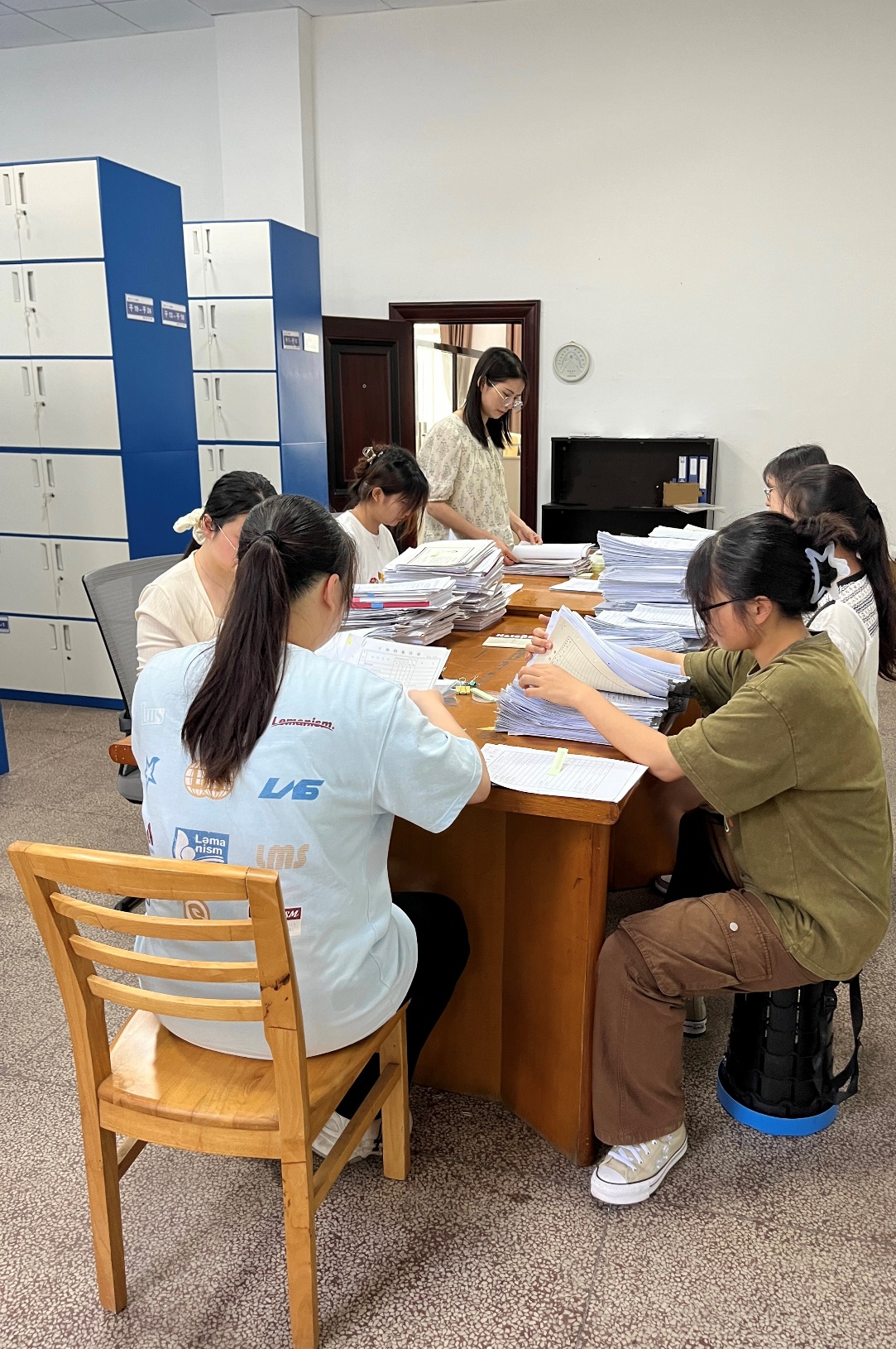 刘书丽老师、何潘毅老师和易珏虹老师带领第二组22人,负责档案馆综合、学生档案的管理和利用。同学们对301、302、401、402四个库房的档案资源进行全面整理,开展了系统的清点核校。同学们全面梳理库藏档案,精准著录种类、数量、保管状态等关键要素,并通过实践深入掌握档案分类编目、整理保管、检索调阅全流程操作。学生们通过亲手整理上万卷档案,掌握了从分类编目到保管利用的完整工作规范。