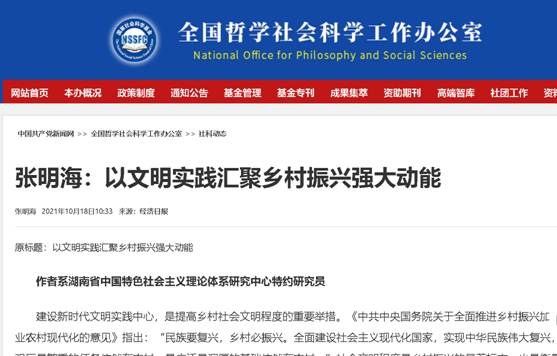 近日,全国哲学社会科学规划办公室门户网站“社科动态”栏目全文转载推介taptap点点马克思主义学院张明海教授的研究成果《以文明实践汇聚乡村振兴强大动能》。该成果2021年10月18日发表于《经济日报》,系张明海教授主…