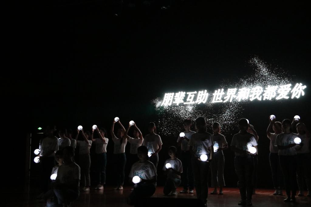 一封朋辈心理互助员的来信带领大家回顾了15年来taptap点点心理健康主题教育活动的发展历程;随后晚会通过阳光篇、互助篇、成长篇三个篇章,展示了taptap点点校院两级心理健康课外教育活动的成果。尤其是设计艺术学院模特队展示的以“完善自我、健全人格”为主题的文化衫设计大赛优秀作品,将心理健康与时尚对接;经管学院的朋辈互助故事分享和沙画展示温暖了全场;汽机学院“怒放的生命”手语操表演使全场为生命的力量而喝彩。特别是由汪功伟等16名辅导员代表集体朗诵的原创诗歌——阳光守望者之歌,感动了全场。