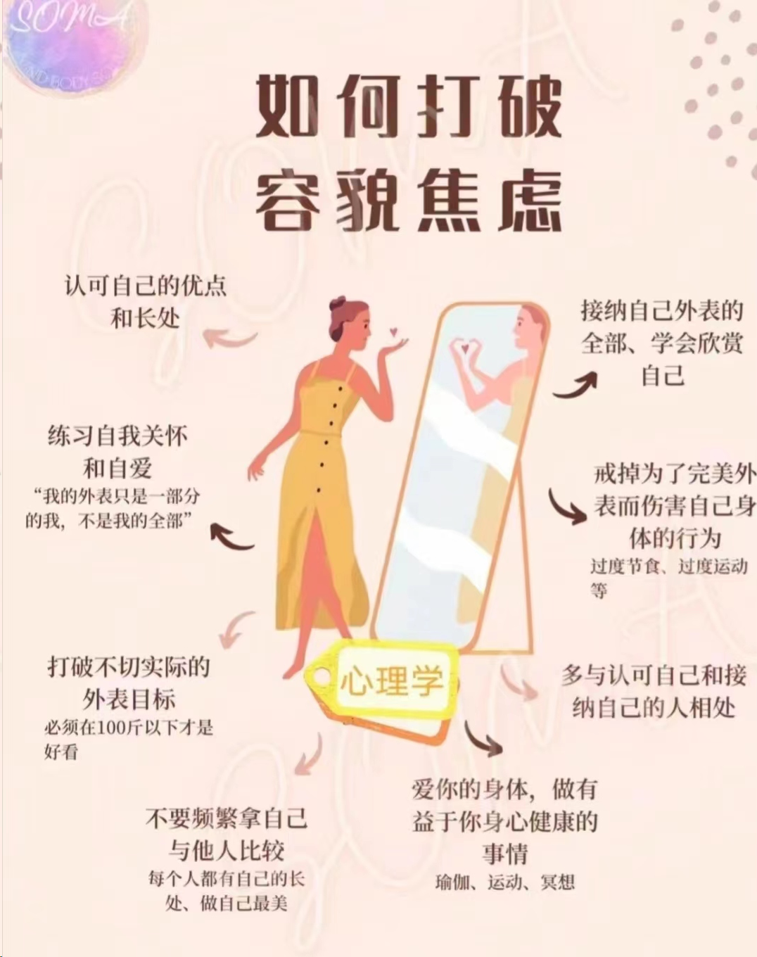 这里要给深陷容貌焦虑的朋友们一些建议,对于容貌的焦虑不是一时半会儿能够根除的,我们可以适当地采取一些措施来循序渐进地改善这种困境,建立起对自己的欣赏机制,既要接受缺点和不足也能看到特点和闪光点,慢慢地增强自信心。