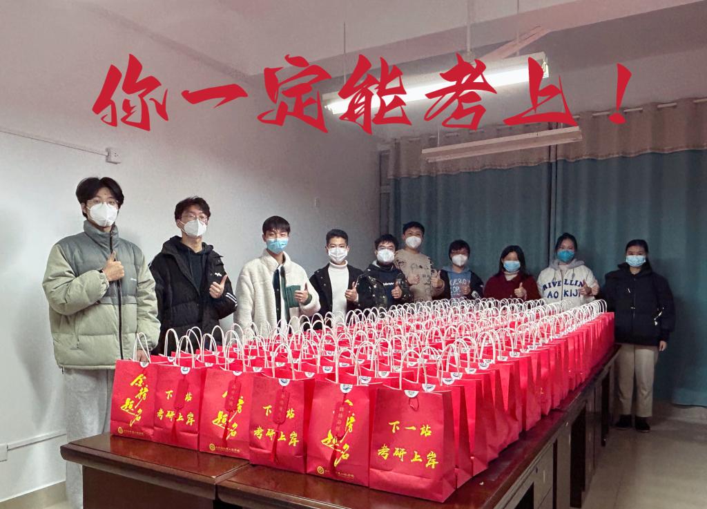 “下一站,上岸”,是考研学子对自己的祝福。宿舍楼内的留言板上,考研学子的愿望语以及学弟学妹们手写的祝福语布满了留言墙。“学长学姐,拼尽全力向前冲,你们一定能够金榜题名!”“说好了,我们一‘研’为定”……“KO焦虑,我们OK的!”电台音频和“追梦赤子心”考研助力MV为每位考研学子舒缓了备考压力,激发了考前动力,助力研考最后一公里。此外,学院老师为每位考研学子送上装有寓意着“时旺运旺”的旺旺雪饼、“成功上岸”的冰糖橙、“考研顺利,金榜题名”定制百事可乐、“解忧排疑”解压玩具、“温暖予你”暖宝宝、定制口罩和心愿祝福卡的“金榜题名”大礼包,一件件富有寓意的物件,从礼包袋的设计、物资的采购,再到装袋、发放,整个过程都寄托了学院对考研学子们的深情祝福。