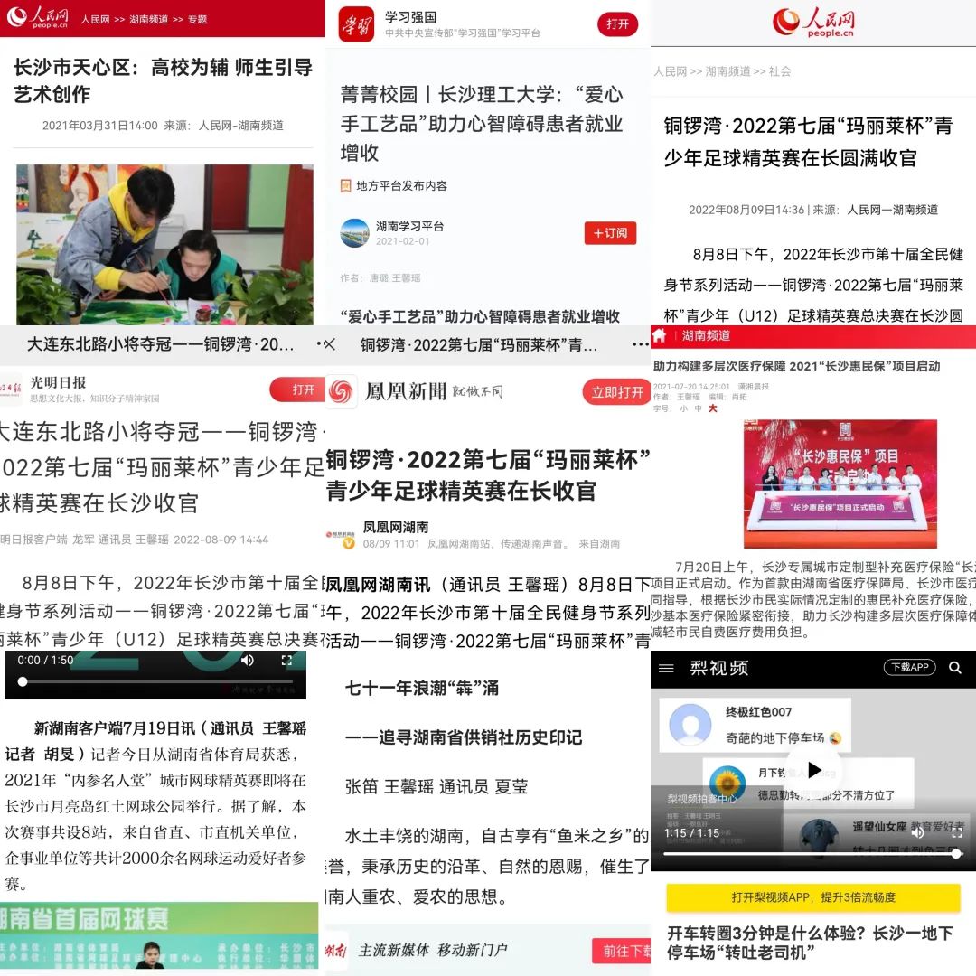 大二时,通过老师推荐,王馨瑶获得了《湖南日报》的实习机会。她坚持每天早上五、六点起床,准时到岗工作。实习过程中,她一如往常严格要求自己,力争在各类工作中磨砺自我,增长见识。实习期间,她加入湖南日报新闻审编小组,负责稿件校对与错误修改;参与湖南省供销合作社第四次代表大会新闻采访,对大会进行全程跟进报道。通过各项专业实践,王馨瑶累计发表稿件72篇,其中多篇被人民网、光明日报客户端、学习强国等国家级媒体平台转载。