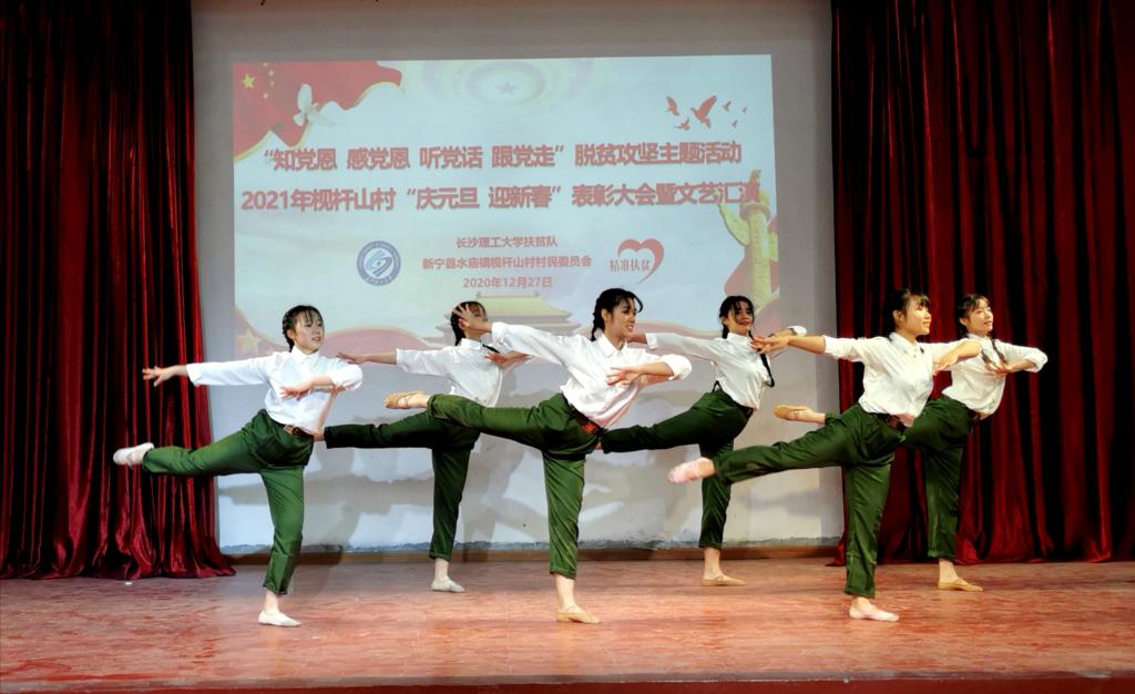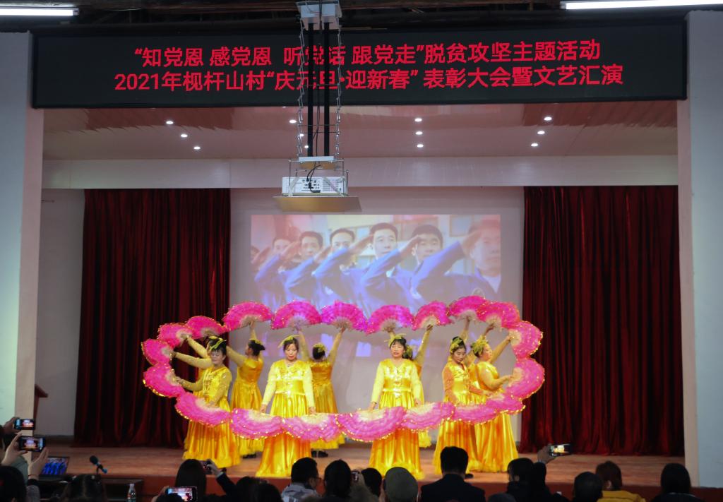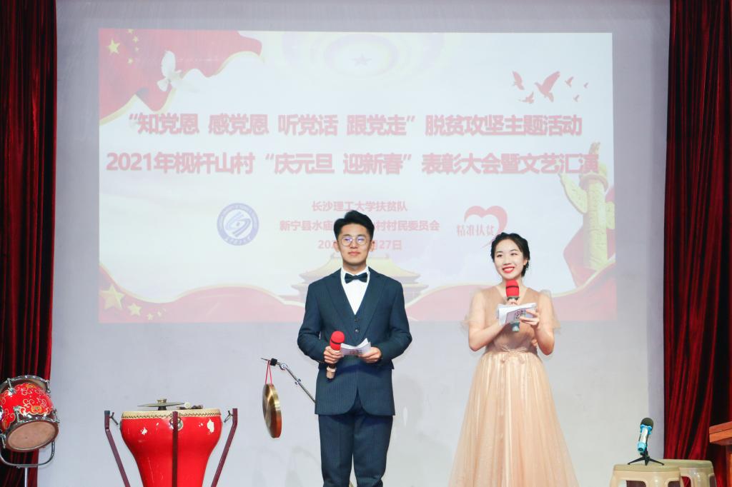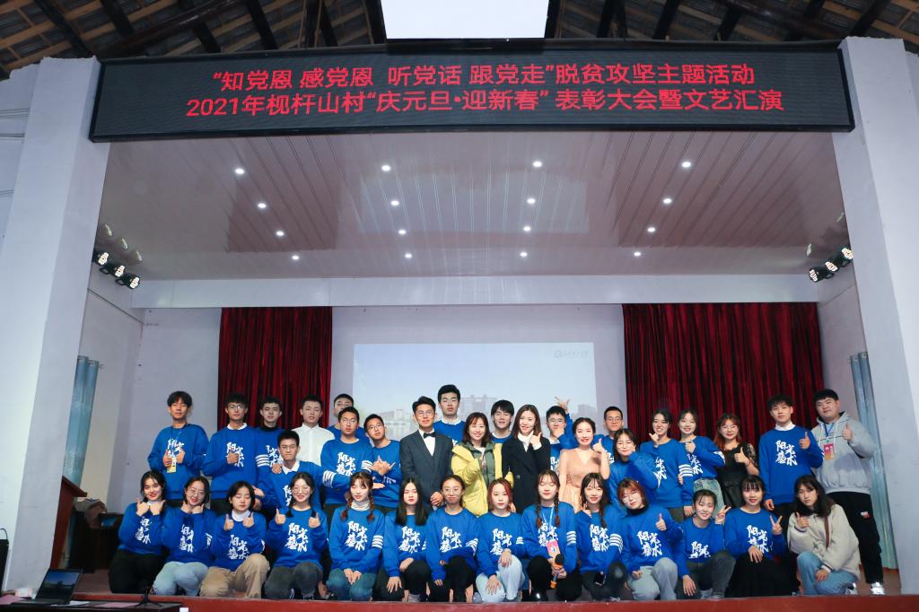 12月27日上午,在taptap点点扶贫点枧杆山村文化大礼堂,500多名村民欢聚一堂,隆重举行2021年“庆元旦•迎新春”表彰大会暨文艺汇演活动。保卫处副处长黄伟,校团委副书记陈璐莎、素质教育办公室主任万馨以及阳光艺术团、阳光radio34名学生受邀参加活动。