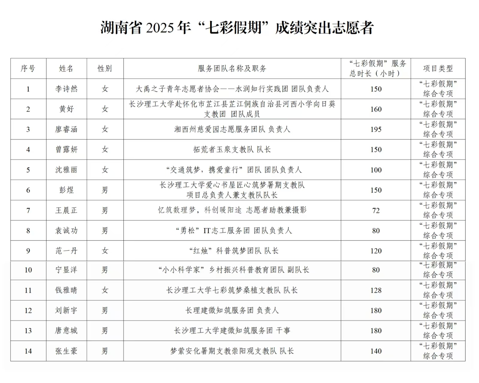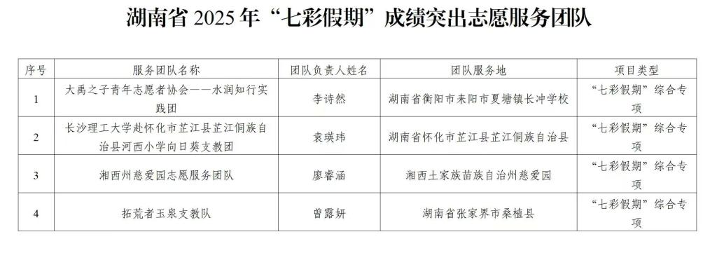 根据《关于实施湖南省2025年青年志愿者关爱农村留守儿童“七彩假期”志愿服务项目的通知》等文件要求,经学校推报、专家评审等环节,现将湖南省2025年“七彩假期”成绩突出志愿服务团队、志愿者名单进行公示,公示期自2025年11月13日至2025年11月17日。