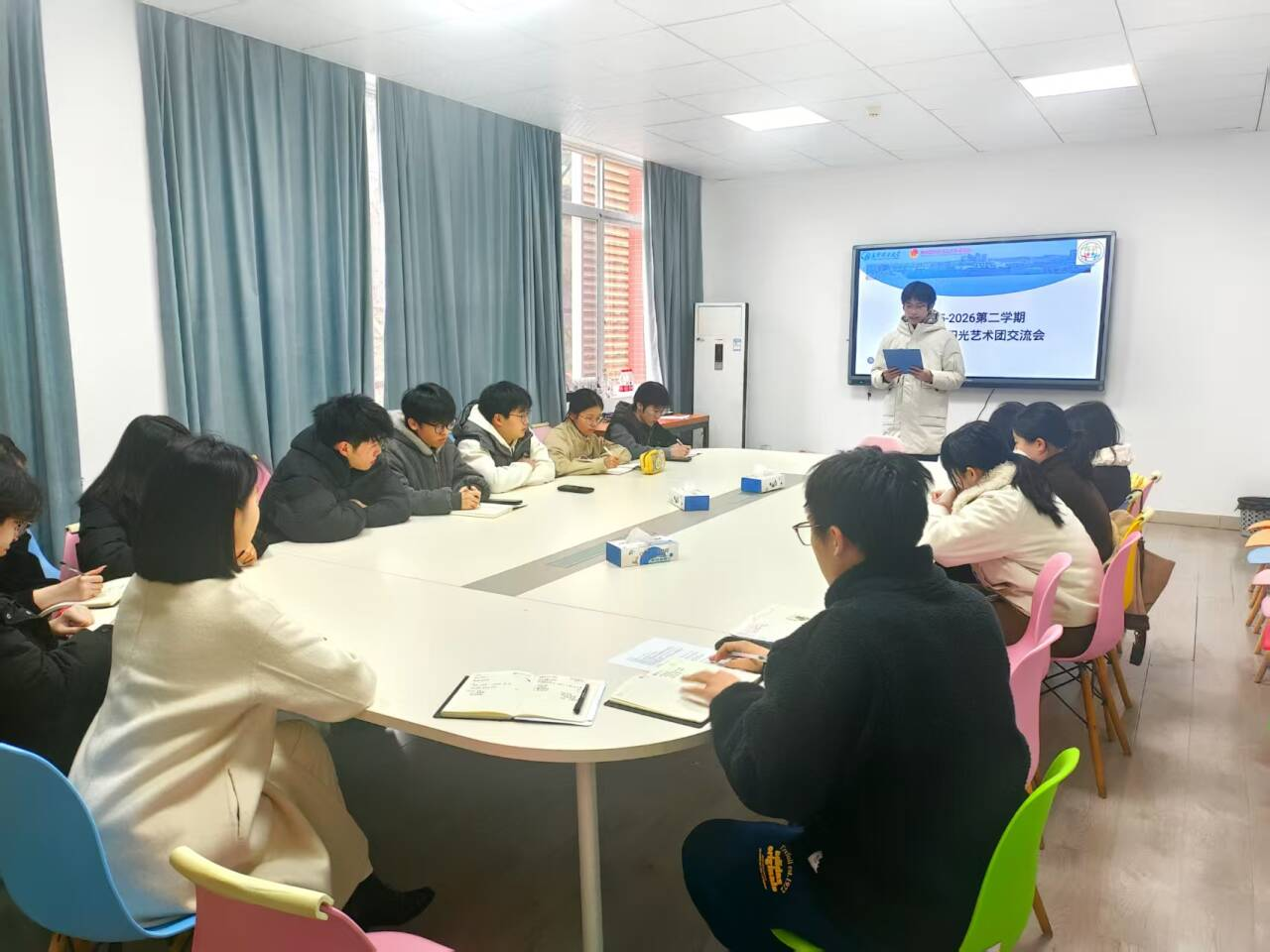 随后,学社联与阳光艺术团代表依次进行自我介绍,增进彼此了解。学社联代表重点围绕宣传工作作专题分享,结合日常运营实践,就宣传推文制作、文案编辑技巧、拍摄相关要点等关键环节展开讲解,为双方宣传工作提质增效提供了实用思路与方法参考。