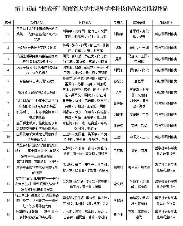 经专家评审,拟推荐15项作品参加第十五届“挑战杯”湖南省大学生课外学术科技作品竞赛。