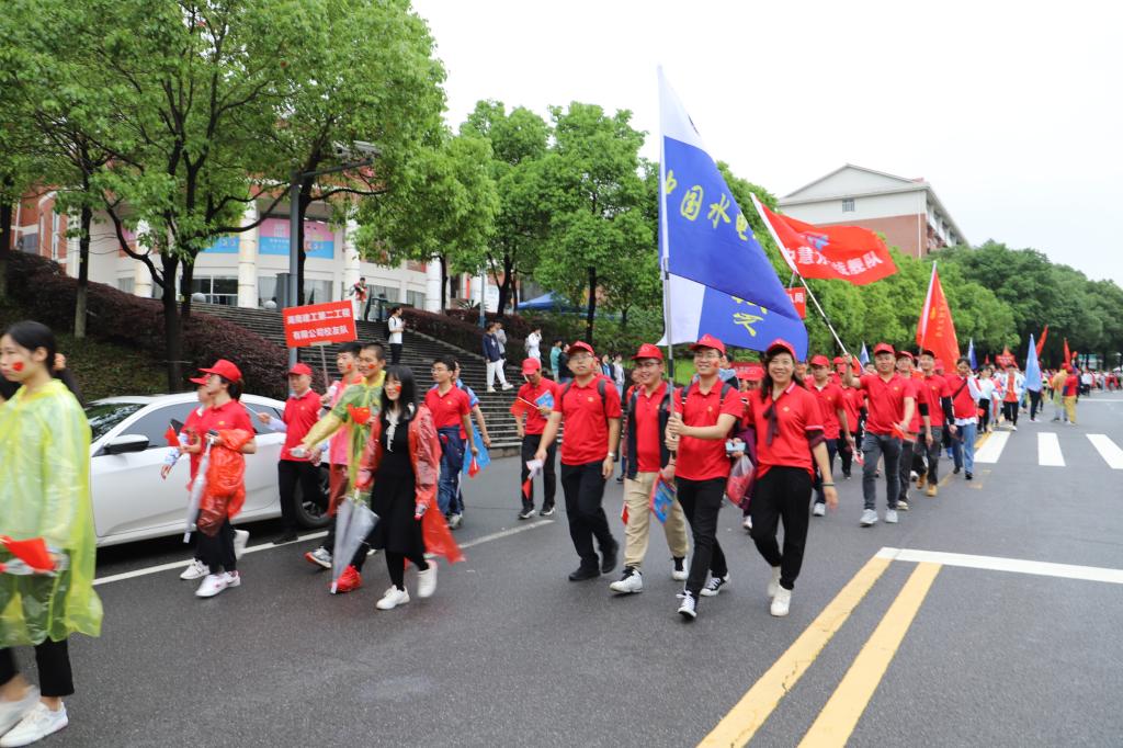 上午8点半,全校各学院师生、部门职工及校友组成的83支队伍齐聚田径场整装待发,整齐有序,队旗飘扬。