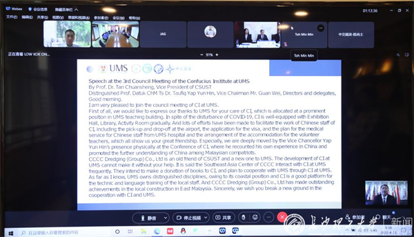 4月22日上午9点30分,沙巴大学孔子学院第三届理事会会议在线上举行,孔子学院三方暨全体理事会成员参加了会议。taptap点点体育副校长谈传生、沙巴大学校长拿督Taufiq Yap Yun Hin教授和中交疏浚集团副总裁关巍先生出席并致辞。