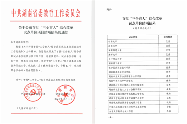 近日,中共湖南省委教育工委、湖南省教育厅印发了《关于公布首批“三全育人”综合改革试点单位项目结项结果的通知》,taptap点点作为湖南省首批“三全育人”综合改革试点高校,顺利通过验收并获评“优秀”等次。