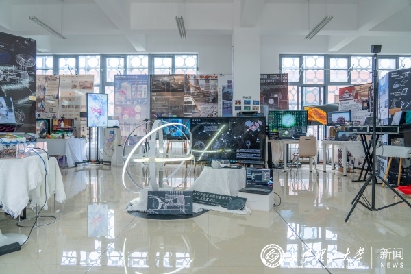 展览现场,艺术学院教师书画作品同期展出,充分展现学院教学相长的艺术生态。数字媒体艺术展区汇集众多数字交互作品;视觉传达设计展区通过动态视觉、品牌升级文化衍生等多元形式重构城市文化符号;环境设计团队将老城区改造方案搬进展厅;工艺美术专业以釉色流淌诉说千年窑火新声;影视摄影与制作展区更以4K影像记录时代脉搏。展览还特别设置数字互动专区,通过科技与艺术的创新融合,让现场观众实现与数字艺术的深度对话。