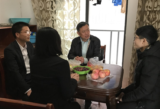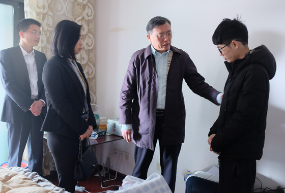 4月8日上午,副校长谈传生在校团委书记陈曦、计通学院党委书记方琼等一行人的陪同下看望租住在长沙市四方坪的患病学生邹勇松。